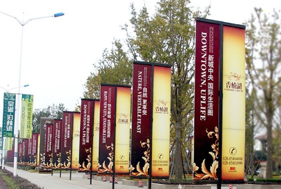 11、道旗一般設置在活動場館周邊以及道路的主路、輔路、便道以外的范圍。可以在短期內樹立廣告主品牌。